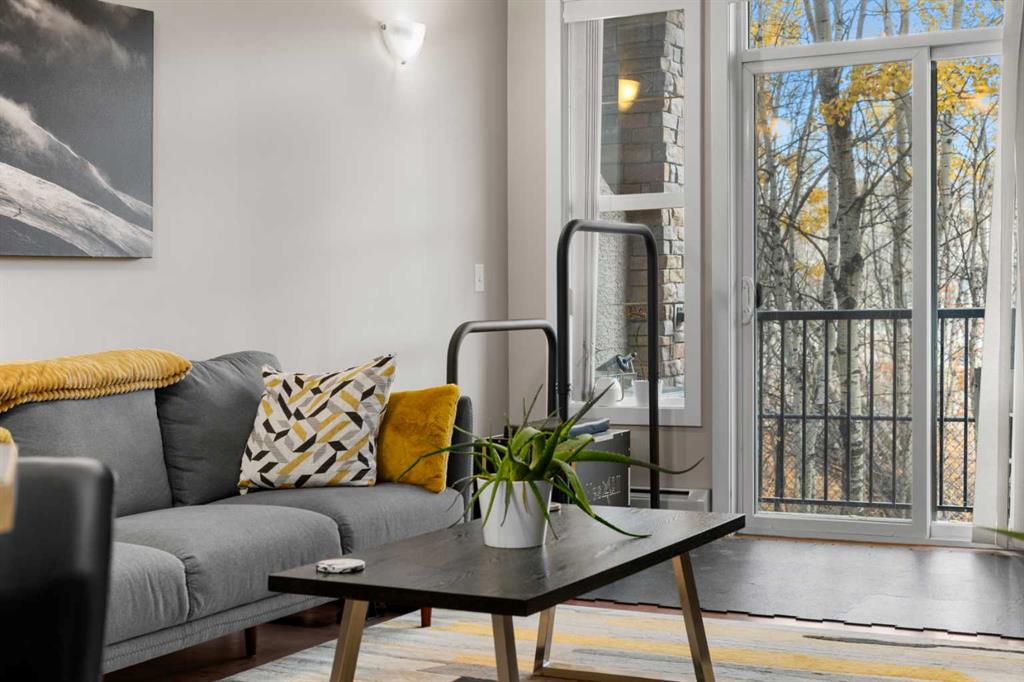 Welcome to this inviting 1-bedroom, 1-bathroom main floor condo perfectly located in the highly sought-after community of Aspen Woods. This thoughtfully designed unit combines comfort, functionality, and tranquility — all within minutes of urban convenience. Step inside to discover 9-foot ceilings and an open-concept layout that feels bright and spacious. The kitchen offers abundant cabinetry, a peninsula island with breakfast bar, and plenty of prep space — ideal for everyday living or entertaining. The ad...