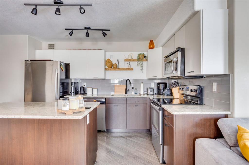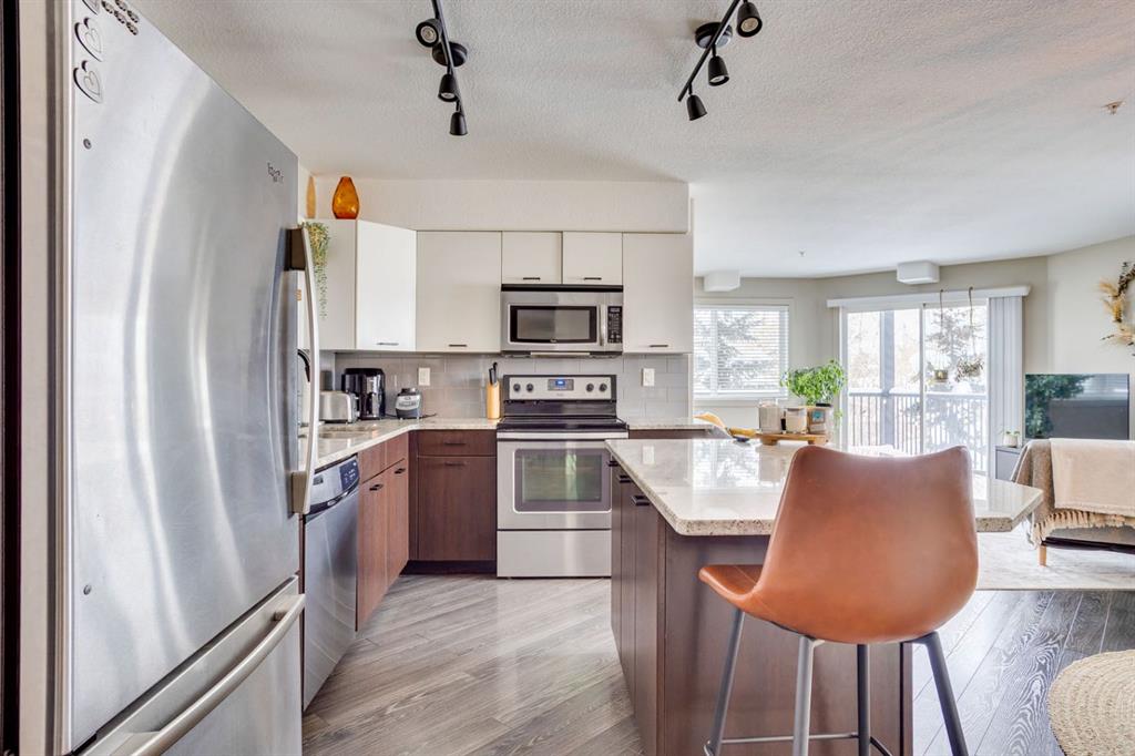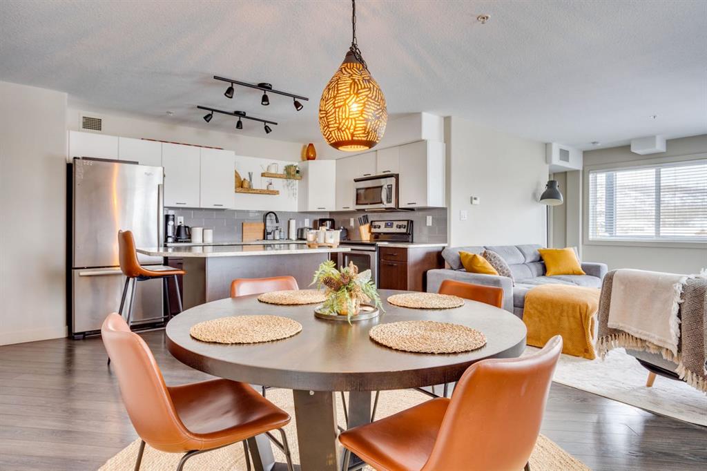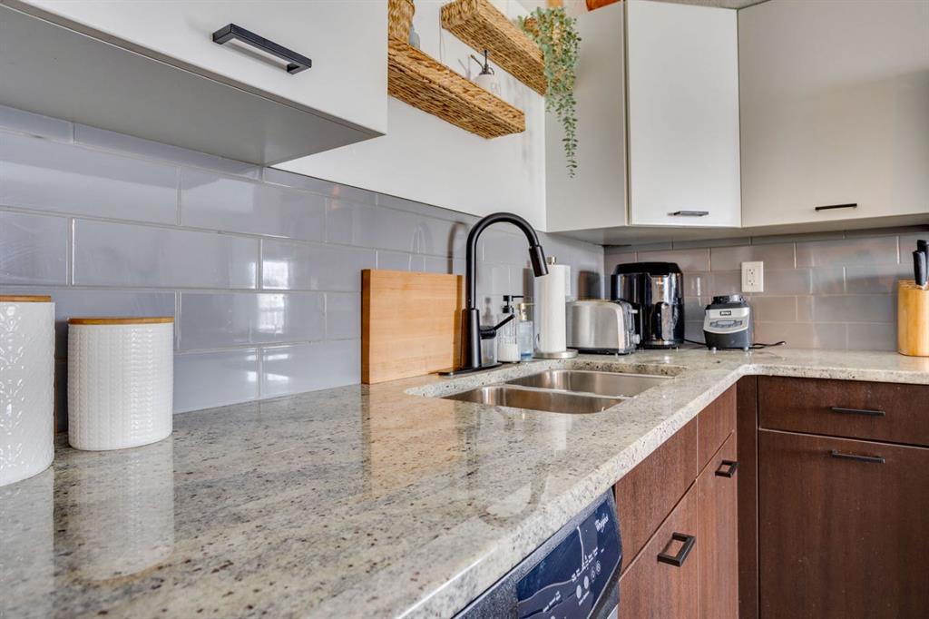 Beautiful Executive Corner Unit in the Heart of Downtown Welcome to Hangingstone Landing, a prestigious downtown residence offering an exceptional executive-style second-floor corner unit with enhanced privacy and a desirable south-facing balcony. This well-appointed 811 sq. ft. open-concept condominium features two bedrooms and two bathrooms, thoughtfully designed to maximize comfort and functionality. The bright, modern kitchen is equipped with laminate flooring, crisp white cabinetry, granite countertops...