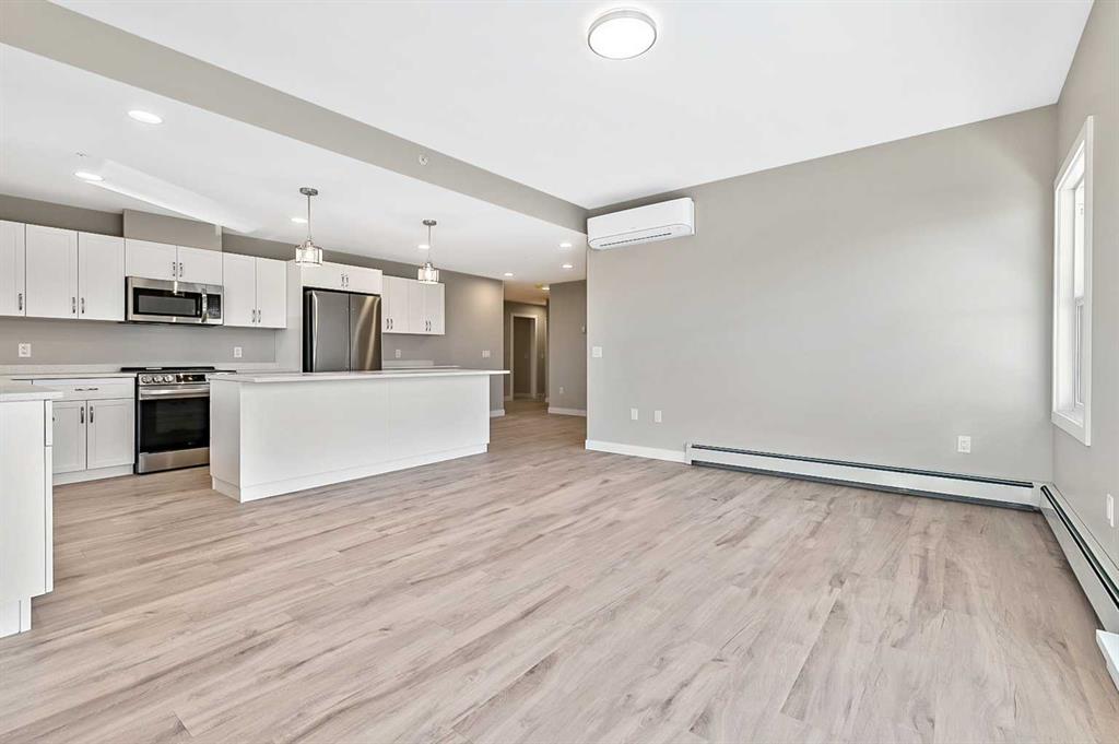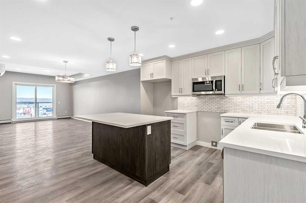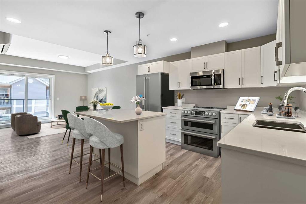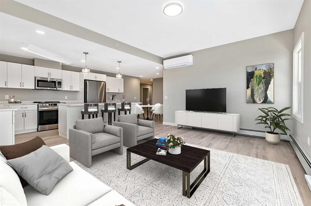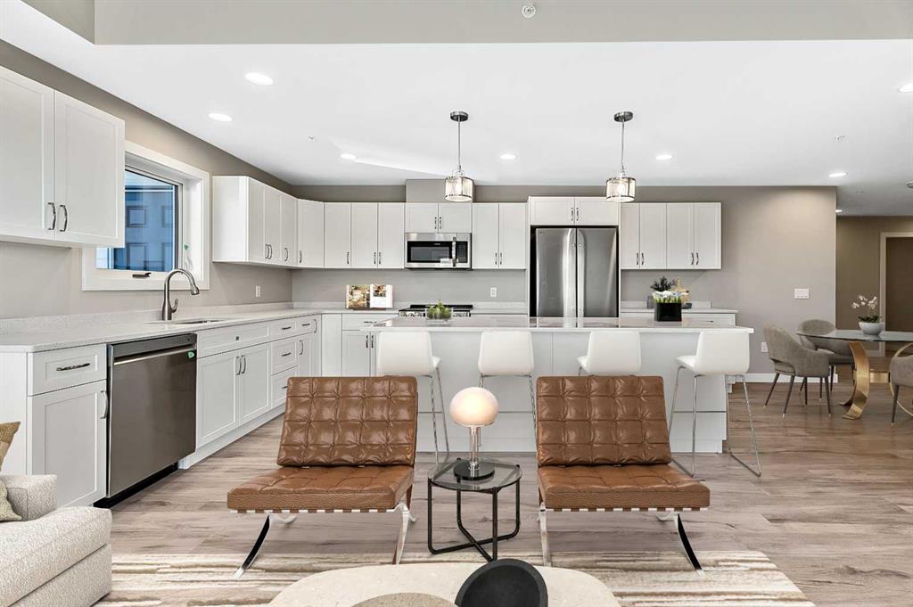 Welcome to modern condo living designed for comfort, quality, and convenience. This well-appointed residence offers 9-foot ceilings, 8-inch hollowcore concrete floors, and a dual-wall construction system, providing exceptional durability and superior soundproofing. The open-concept kitchen is finished with quartz countertops, a large island with power and pendant lighting, built-in microwave and dishwasher, and a water line to the refrigerator for an ice maker—perfect for both everyday living and entertaini...