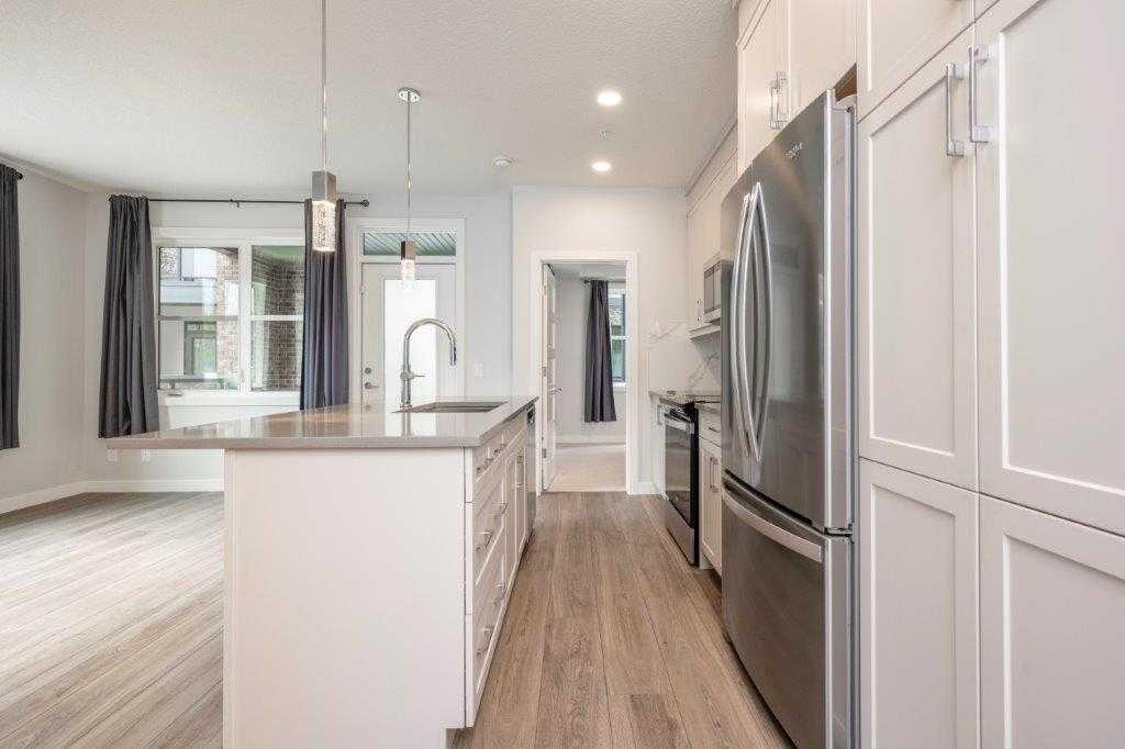 Welcome to Greenbriar, a vibrant and growing community in northwest Calgary. This south-facing main-floor condo offers 893 sq. ft. of well-designed living space with 2 bedrooms and 2 full bathrooms, plus a private terrace with a separate exterior entrance. The kitchen features quartz countertops, full-height cabinetry, upgraded stainless steel appliances, and a large island, ideal for everyday living and entertaining. The open-concept layout connects the kitchen, dining, and living areas, creating a brig...