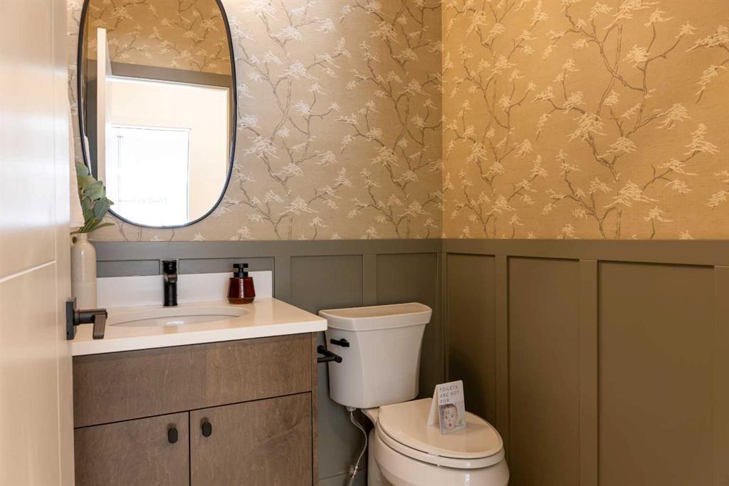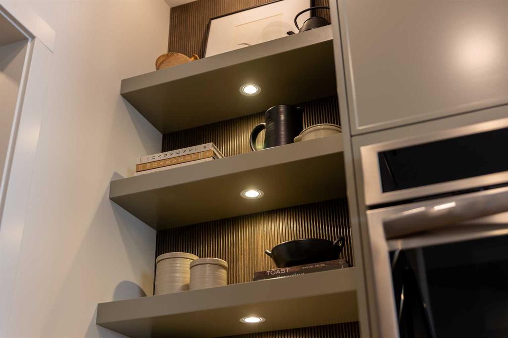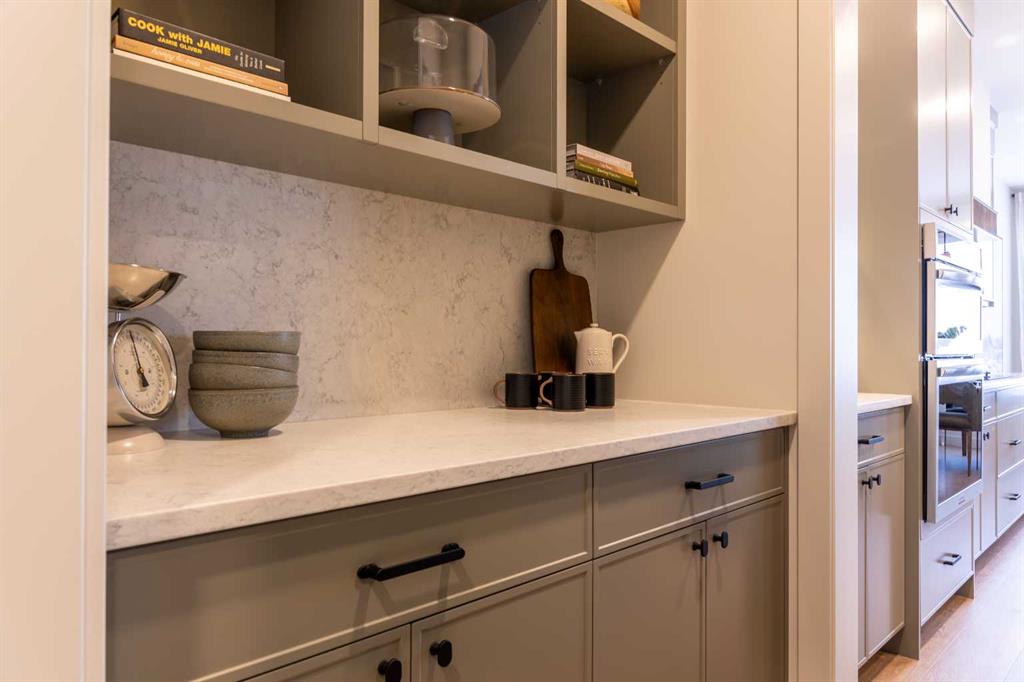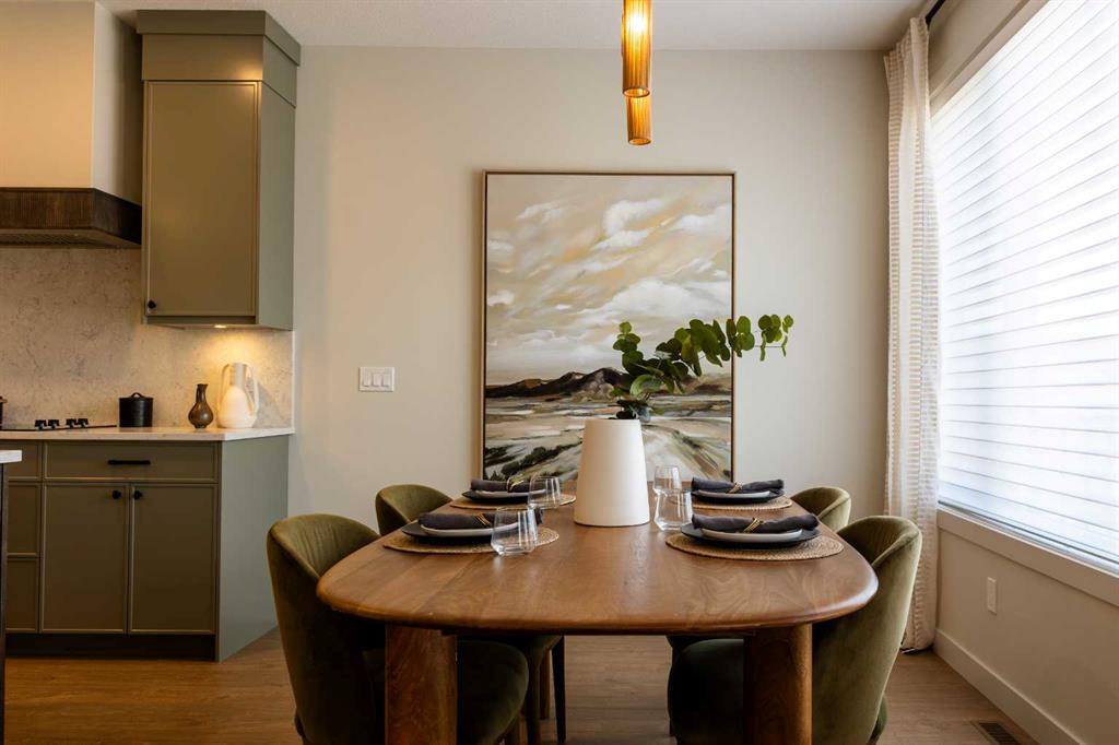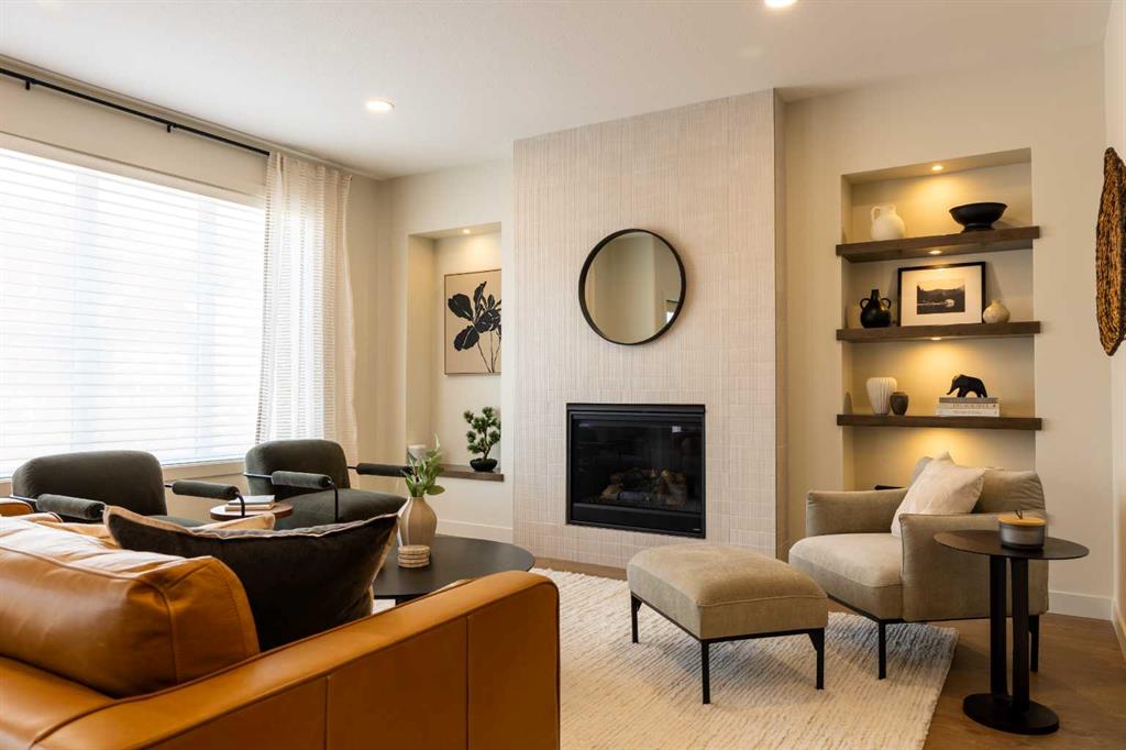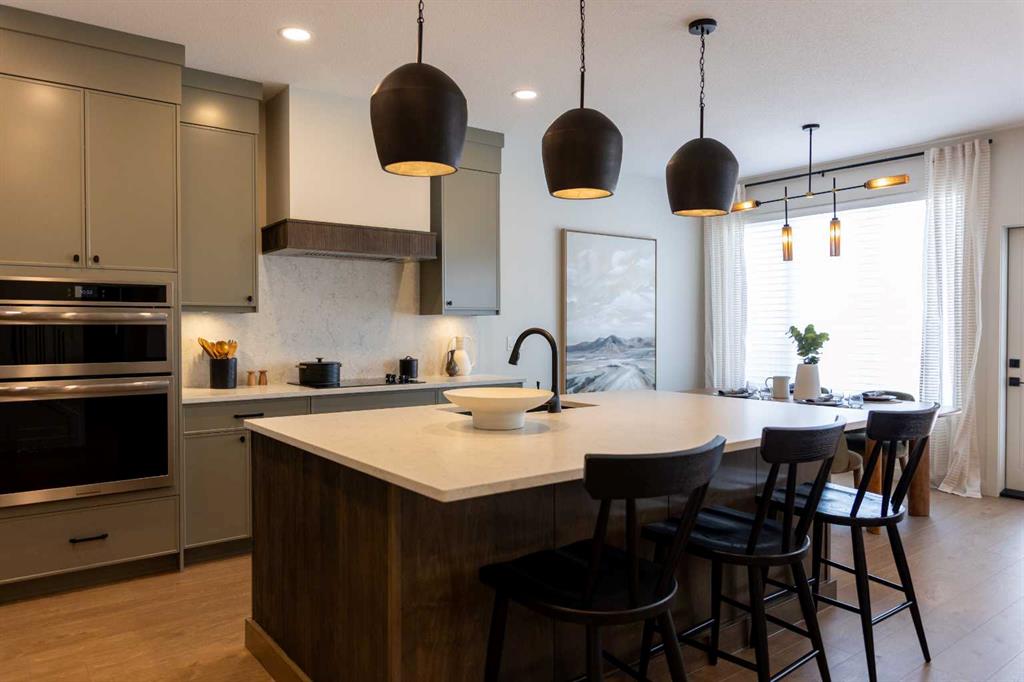 Showhome upgrades paired with modern elegance have created this one of a kind, show stopping home that you simply NEED to see. From the moment you step through the front door, the warm organic details will instantly make you feel at home. The main floor features a spacious foyer with closet, and then in to your large main living area where you will immediately fall in love with this kitchen. Two tone cabinets with a wood island, hood fan with wood detail, full height cabinet and open shelving detail, quartz...
